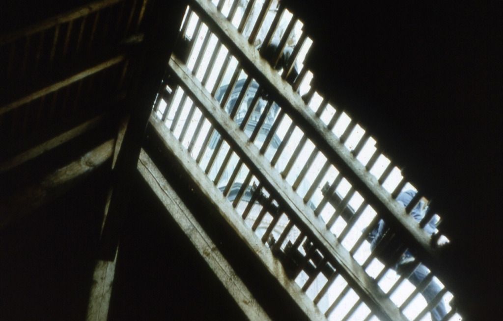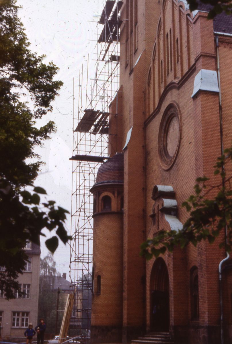 Sturmschaden an der unteren Kupferabdeckung wird beseitigt, obwohl "eigentlich", also zu DDR-Zeiten, weder ein Gerüst noch Kupferblech beschafft werden konnte. konnte.